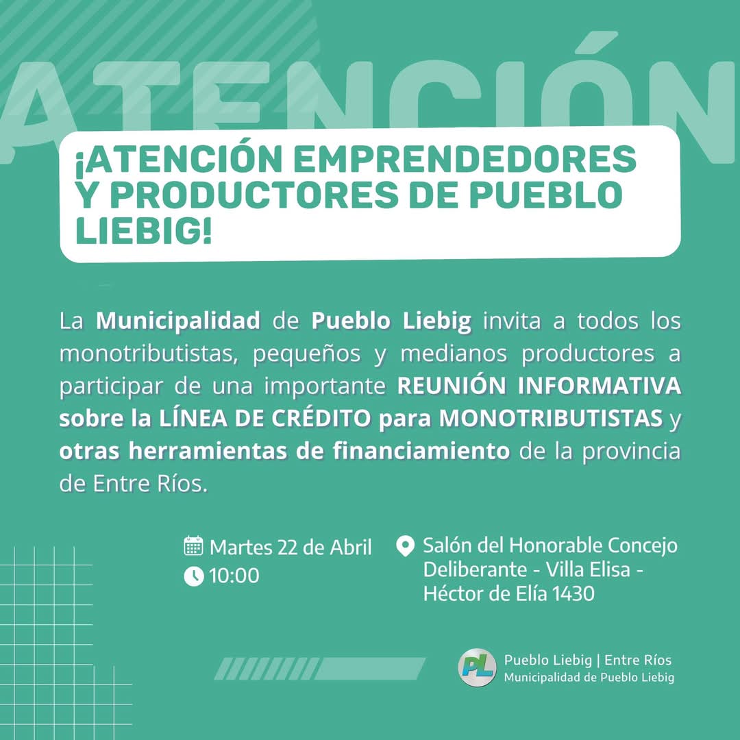 Read moreLa Municipalidad de Pueblo Liebig invita a todos los monotributistas, pequeños y medianos productores a participar de una importante REUNIÓN INFORMATIVA sobre la LÍNEA DE CRÉDITO para MONOTRIBUTISTAS...
