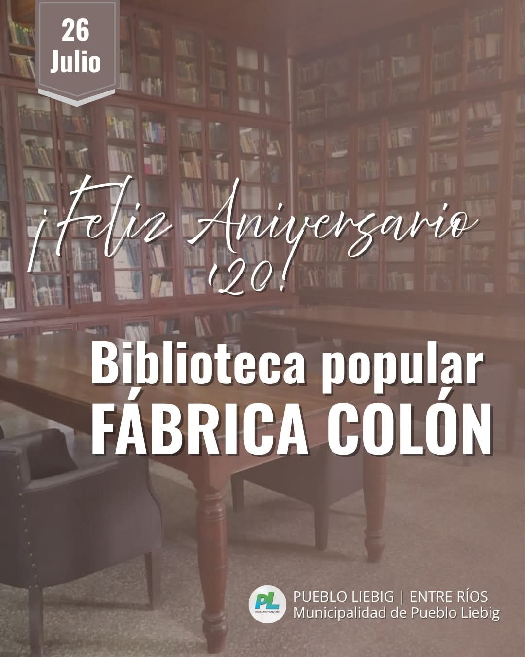 Read moreDesde la Municipalidad de Pueblo Liebig saludamos con profundo reconocimiento a la Biblioteca Popular Fábrica Colón en su 120° aniversario. Un espacio de cultura, memoria y encuentro que...