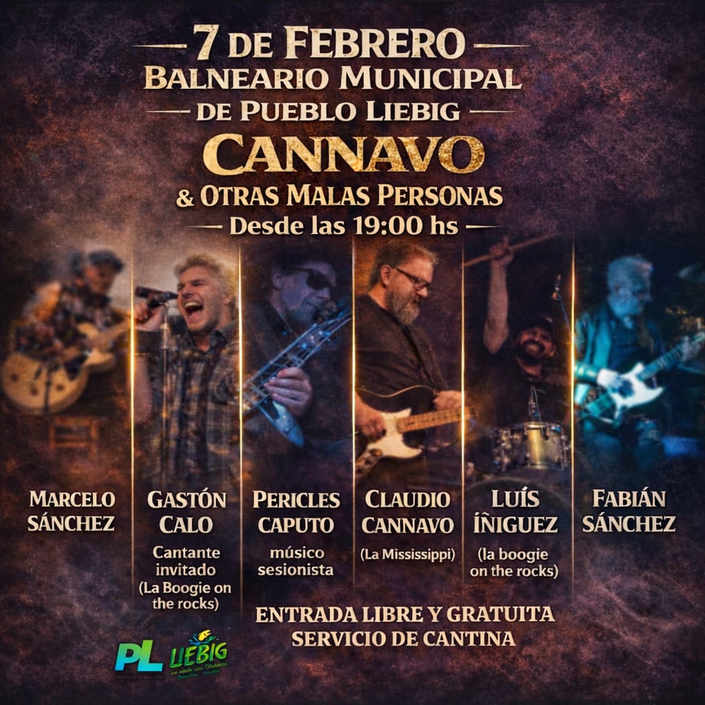 Este sábado 7 de febrero, el Balneario Municipal de Pueblo Liebig se llena de música con: Cannavo & Otras Malas Personas • Marcelo Sánchez • Gastón Calo –...