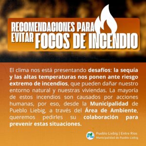 El clima nos está presentando desafíos: la sequía y las altas temperaturas nos ponen ante riesgo extremo de incendios, que pueden dañar nuestro entorno natural y nuestras viviendas. La mayoría de estos incendios son causados por acciones humanas, por eso, desde la Municipalidad de Pueblo Liebig, a través del Área de Ambiente, queremos pedirles su colaboración para prevenir estas situaciones.